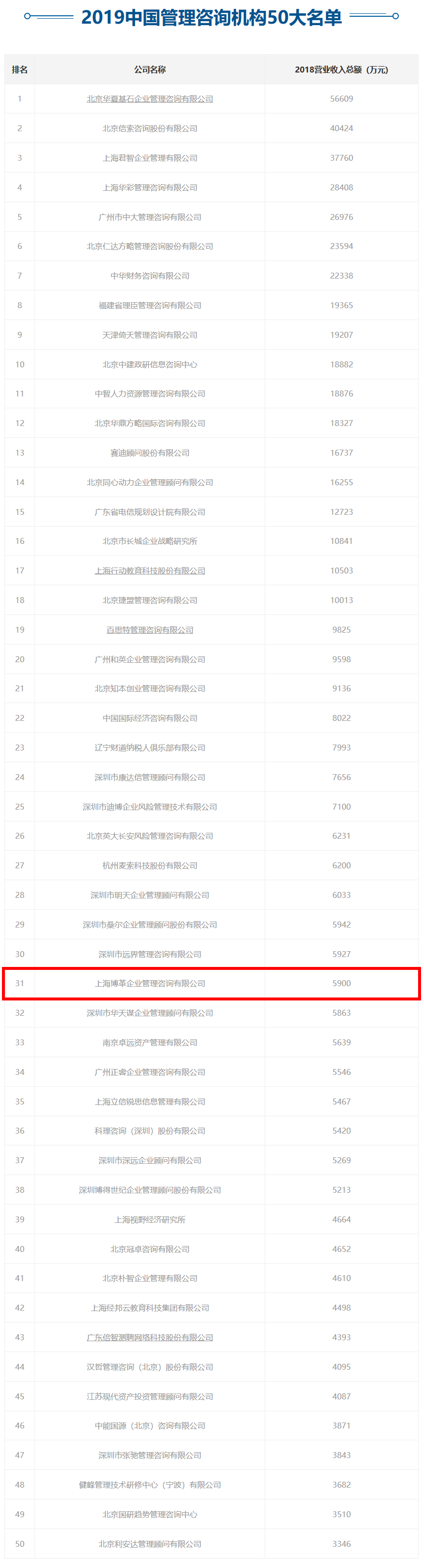 2020年1月10日,中國企業聯合會管理咨詢委員會、中國企業聯合會培訓工作委員會、企業管理雜志社聯合發布了“2019中國管理咨詢機構50大名單”(詳見附圖)。上海博革企業管理咨詢有限公司(簡稱博革咨詢)名列其中,位列第31位。