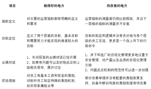 該銅礦目前已經(jīng)建立了一套完整的業(yè)績(jī)管理體系,然而在指標(biāo)的精確衡量,目標(biāo)的溝通,以及業(yè)績(jī)對(duì)話(huà)和獎(jiǎng)懲機(jī)制上仍有一定的提升空間項(xiàng)目做得好的地方待改善的地方