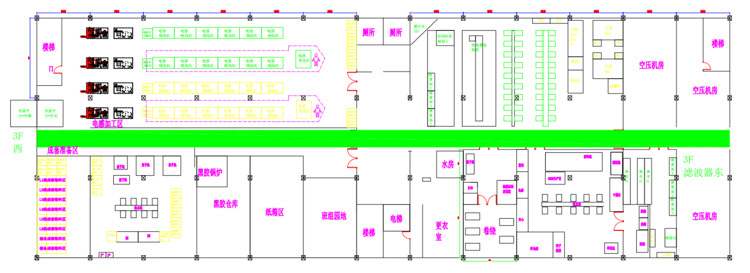 從宏觀層面,考慮整個濾波器生產(chǎn)車間的功能區(qū)域,減少物流搬運次數(shù);構(gòu)建連續(xù)流的生產(chǎn)線,導(dǎo)入物流配送系統(tǒng)應(yīng)用ECRS原則、簡易自動化等方法,重新提排布生產(chǎn)線。