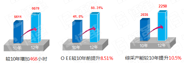 通過以提高設(shè)備綜合效率OEE為主要手段的一系列措施實施,綜采較2010年增加實際作業(yè)生產(chǎn)時間468小時,可多產(chǎn)煤80多萬噸。目前綜采OEE較2010年提升8.51%;產(chǎn)能較2010年提升10.5%;